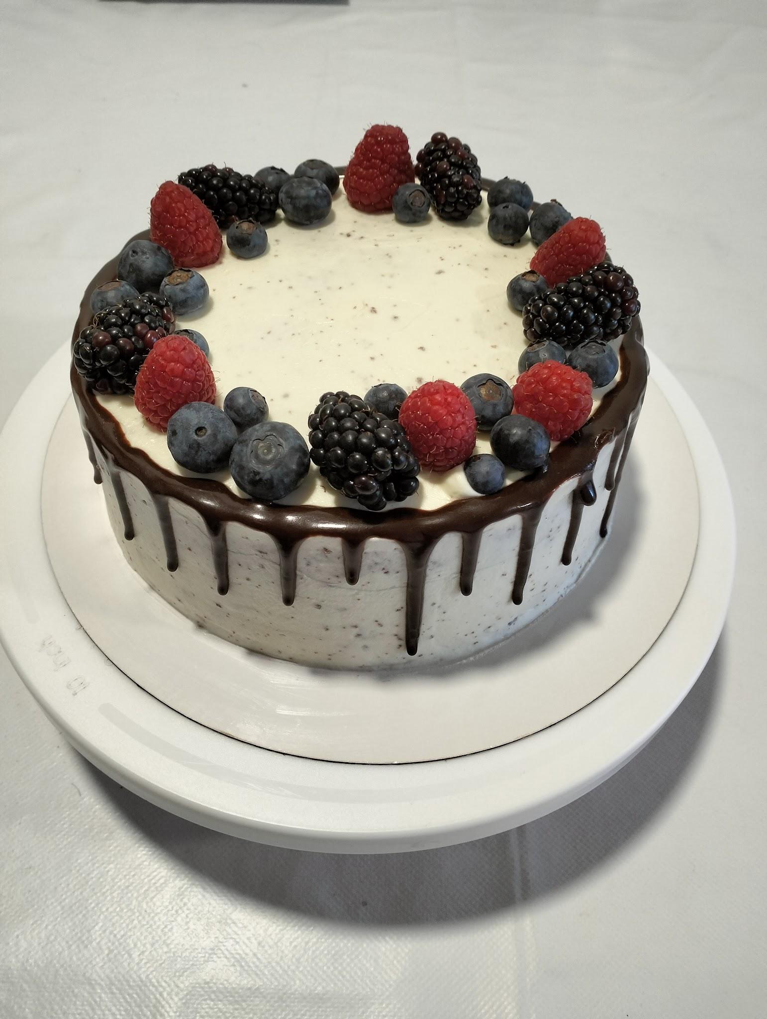 Tarta de Bizcocho chocolate con crema de nata, diseño de frutas y glaceado